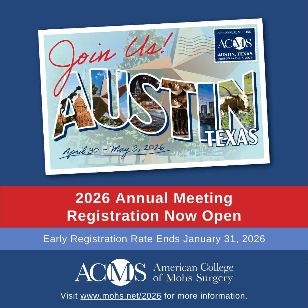 « All Events ACMS 58th Annual Meeting April 30 - May 3 « American College of Mohs ADC 2026 103rd Annual Conference » + Google Calendar+ Add to iCalendar Details Start: April 30 End: May 3 Website: http://mohscollege.org/for-physicians/annual-meeting/2026-annual-meeting/abstractsposters Venue JW Marriott, Austin, Texas